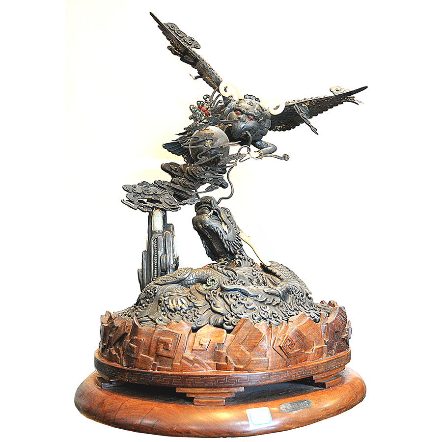 本品是中國傳統(tǒng)金屬鍛鏨技藝第二代傳人、工藝美術大師康文昇的絕世之作,同時參與制作的還有我單位多位高級技師。曾經(jīng)榮獲中國輕工部工藝美術品百花獎優(yōu)秀新產品二等獎。