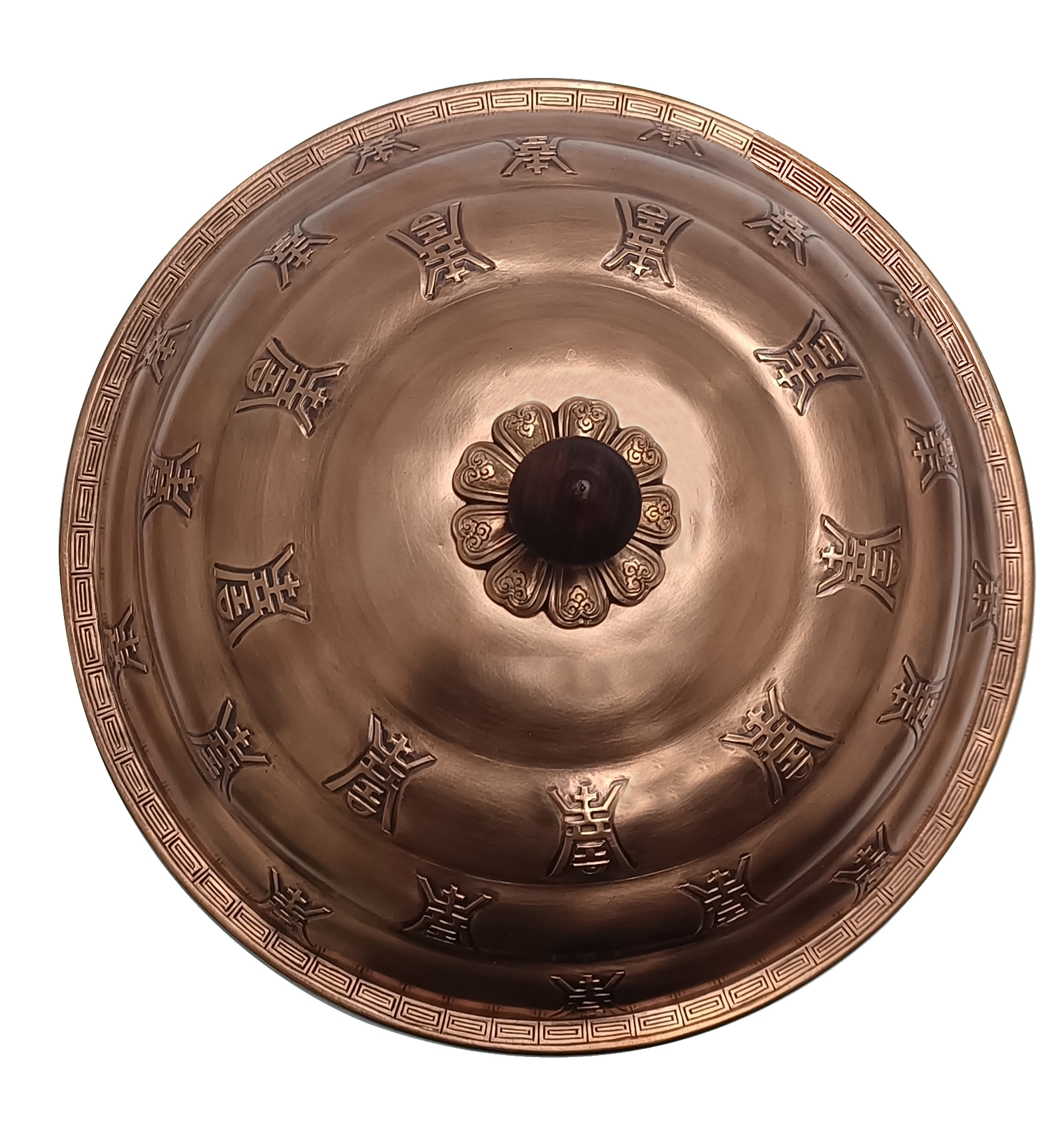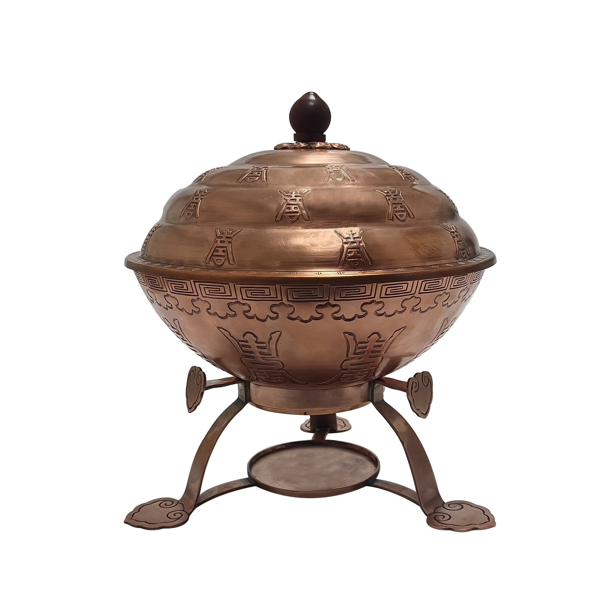 我公司設(shè)計(jì)制作的壽字暖鍋由鍋蓋、鍋身、三足如意托三部分構(gòu)成。壽字暖鍋形制源于宮廷,器形華麗,鍋身為紫銅打造。現(xiàn)代研究表明,人體攝入適量銅元素,能促進(jìn)骨骼、內(nèi)臟及神經(jīng)系統(tǒng)發(fā)育;促進(jìn)細(xì)胞生成,預(yù)防貧血。暖鍋通體以非遺技藝金屬鍛鏨制作而成,鏨有壽字紋、回字紋、如意紋,寓意富貴長春、福壽延綿。
