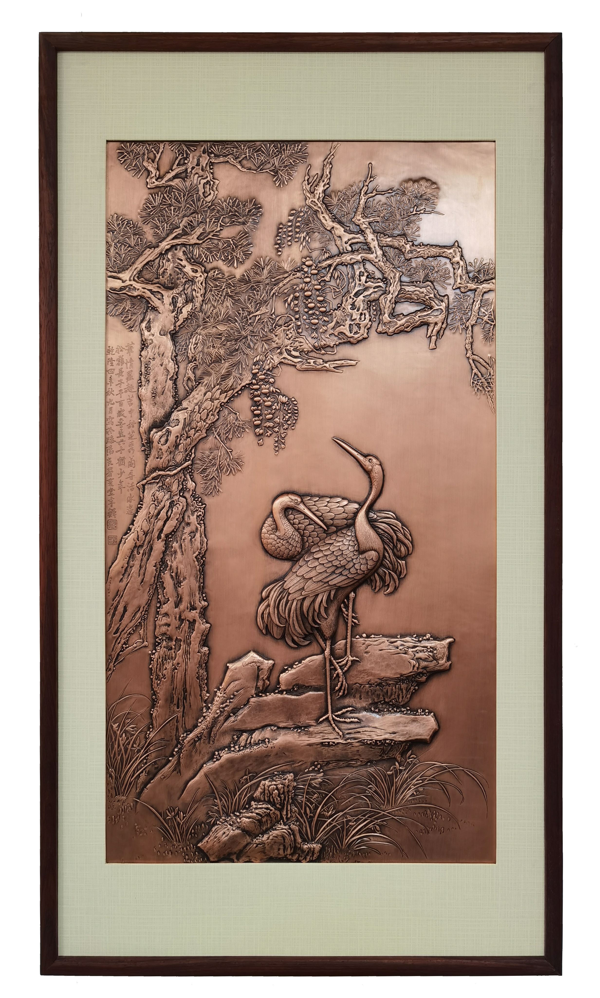 《松鶴延年》紫銅壁畫取材自清代揚州八怪之一——李鱓的畫作。奇石上,兩只仙鶴單足佇立,一只身體微蜷,回首望向同伴,有綣繾之態;另一只仰首顧盼,神采飛揚。一旁的松樹枝葉扶疏、蒼翠遒勁,一株藤蘿攀援而上,花苞下垂,累累相貫如連珠。奇石下,幾株蘭花幽幽綻放,清麗淡雅。松乃“百木之長”,鶴是“一品文禽”,蘭為“花中君子”,奇石是“山川大地之精華”,藤蘿堅貞且為掩映之物,最能遮蔽與映襯。此壁畫集松、鶴、蘭、奇石、藤蘿于一身,極寫忠貞、高貴、長壽、吉祥之意,觀之有仙氣迎面之感。