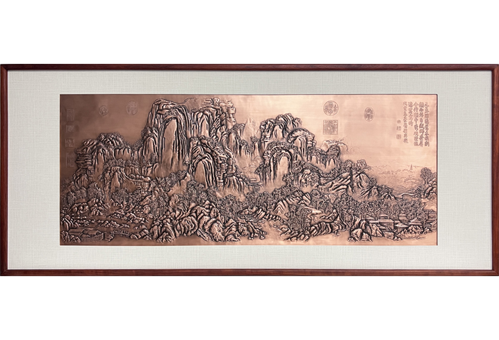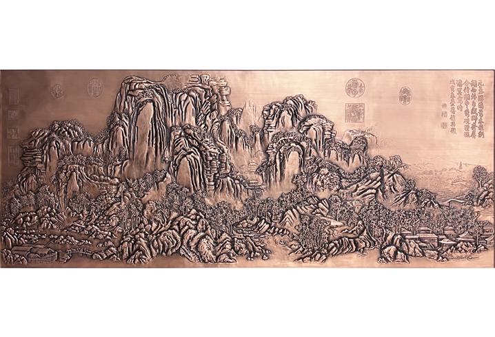此壁畫采用非遺工藝——金屬鍛鏨——手工制作而成,匠人所鏨線條勁健秀逸,如綿里裹針,再現了原作“氣象蕭疏、煙林清曠”的畫境。