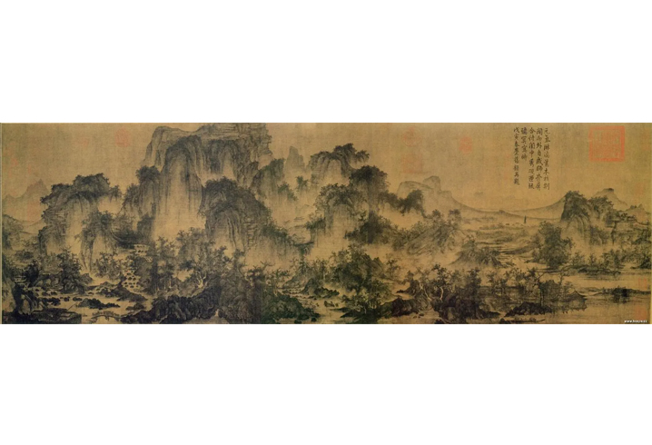 本作品取材自北宋李成的畫作《茂林遠岫圖》。李成,李唐宗室后裔,少時博通經史、學識淹貫,因滿懷抱負不得施展,故寄情于詩酒書畫,與關仝、范寬并稱北宋山水畫三大家。