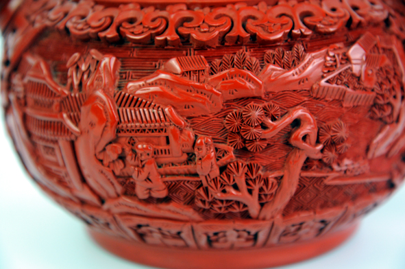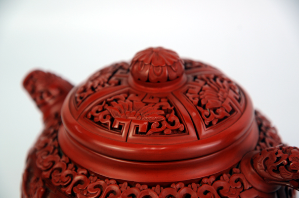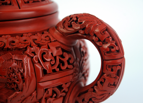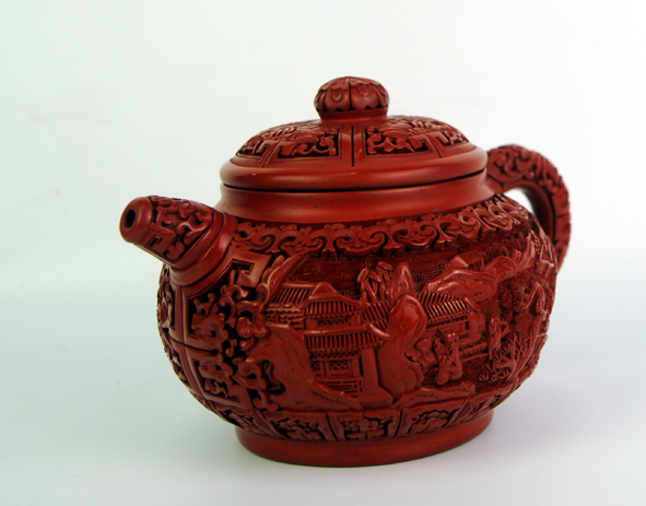 外表為漆,內(nèi)部為砂,兩種材質(zhì)、兩種工藝相結(jié)合,既可沖茶泡茶又可把玩欣賞。表面紋飾為風(fēng)景圖案,設(shè)計(jì)精美,刀法精湛。