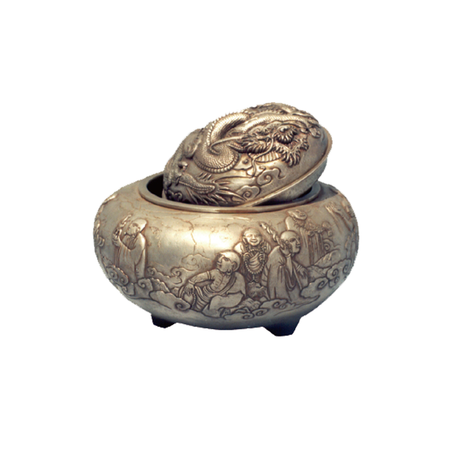 熏爐為點燃香料熏香所用。采用純銀997克,結合了手工鍛鏨中的平雕、浮雕和圓雕技法制作而成。爐身花紋為佛教故事十六羅漢圖案,爐蓋紋飾為一條騰空的大龍,喻意消除煩惱,不再生死輪回受人間之苦。