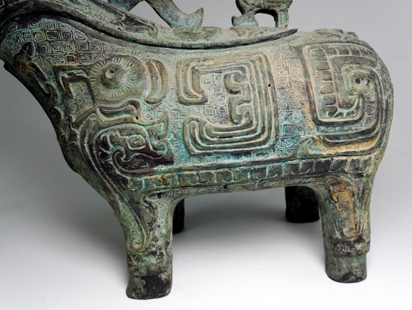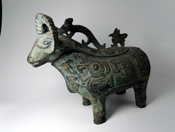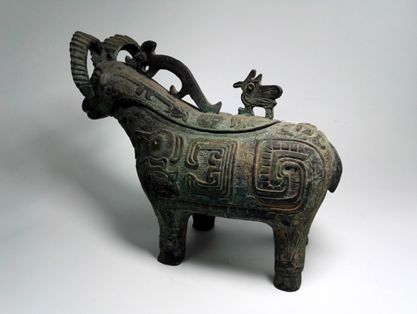 容酒器 商代后期作品。此器以綿羊為造型,通體采用龍、鳳、鳥等各種神話傳說動物吉祥裝飾,表現出強烈的祭器特征,周邊紋飾精美,充分體現羊在古代象征富裕的特征,寓意財運亨通。